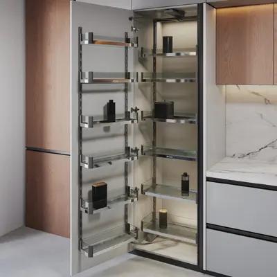 With the use of matte wood laminates, you get the charm of natural wood textures without the maintenance challenges of real timber. These finishes pair beautifully with smart pull-outs, tall storage units, and corner solutions, ensuring that your kitchen is not just beautiful but also highly functional.